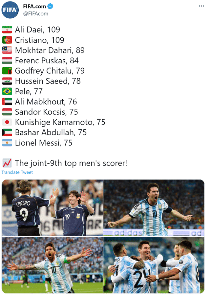 目前C罗和阿里-代伊领跑着男子国家队射手榜,两人均打进了109球,梅西则凭借今天的两个进球升至并列第九。