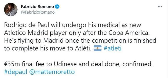美洲杯后,德保罗会作为马竞新援接受体检,届时他将飞往马德里。