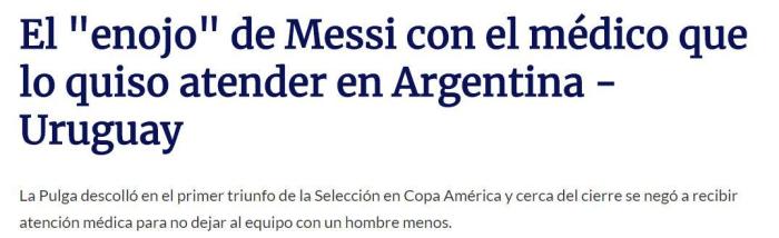 Tyc称,梅西不愿接受队医治疗是因为他不想在球队只领先1球的情况下在最后阶段面对以少打多的局面。