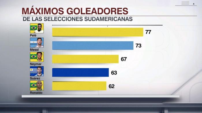 如图,本场比赛结束之后,梅西在国家队的进球数上升到了73球,他是目前南美洲国家队银靴,而第一的是巴西球王贝利,他的国家队进球数是77球。而梅西身后排名第三的是巴西的内马尔,他的国家队进球数是67球,第四则是乌拉圭球星苏亚雷斯,他的国家队进球数是63球,而第五是巴西的罗纳尔多,他的国家队进球数是62球。可以说,梅西和内马尔超越贝利不过是时间的问题。