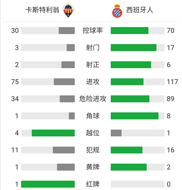 全场比赛结束,西班牙人客场3-1逆转战胜卡斯特利翁。