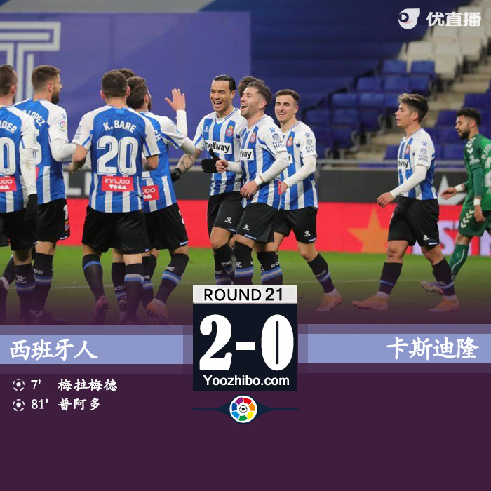 最终全场比赛结束,西班牙人2-0卡斯特利翁