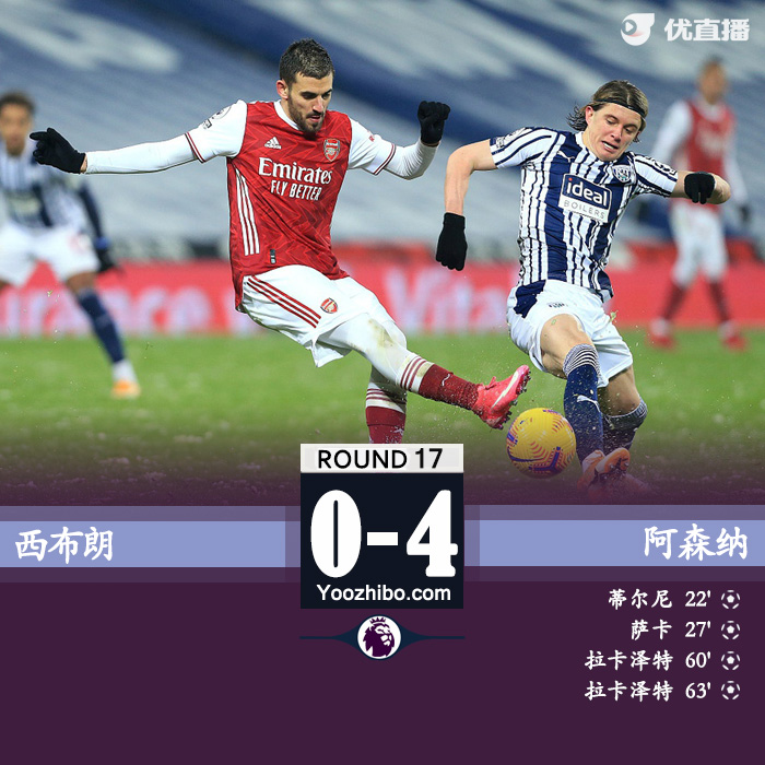 第64分钟,蒂尔尼左路传中,拉卡泽特撞射再入一球完成双响,西布朗0-4阿森纳。