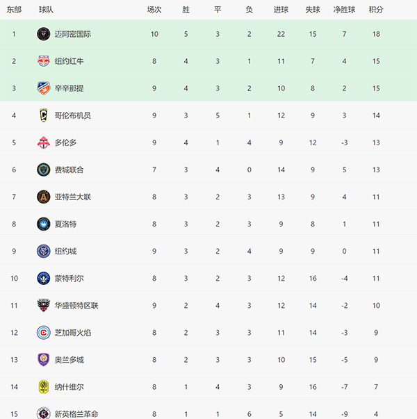 目前东部的最新排名,迈阿密国际5胜3平2负,积18分,位居东部第一,力压纽约红牛和辛辛那提,值得一提的是,相比起迈阿密国际,纽约红牛少赛2场,辛辛那提少赛一场,东部的竞争还是非常激烈的。