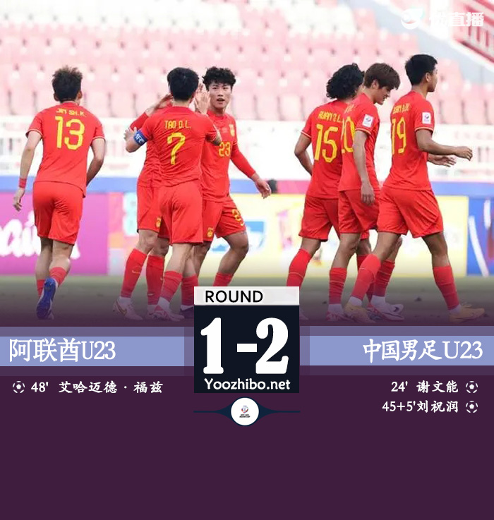 第24分钟,国奥的角球机会,阿联酋队员法齐头球解围没能顶远,谢文能抓住机会果断凌空抽射破门,阿联酋国奥0-1中国国奥。 第45+5分钟,阿联酋后场传球失误送礼,刘祝润迅速上抢,禁区内冷静劲射得手,阿联酋国奥0-2中国国奥。