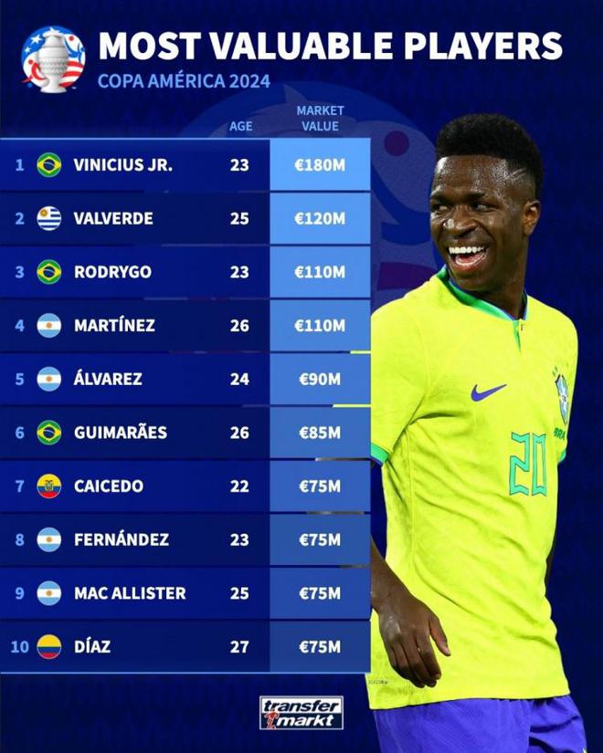德转公布美洲杯身价:维尼修斯居首,前10名中阿根廷球员占4位