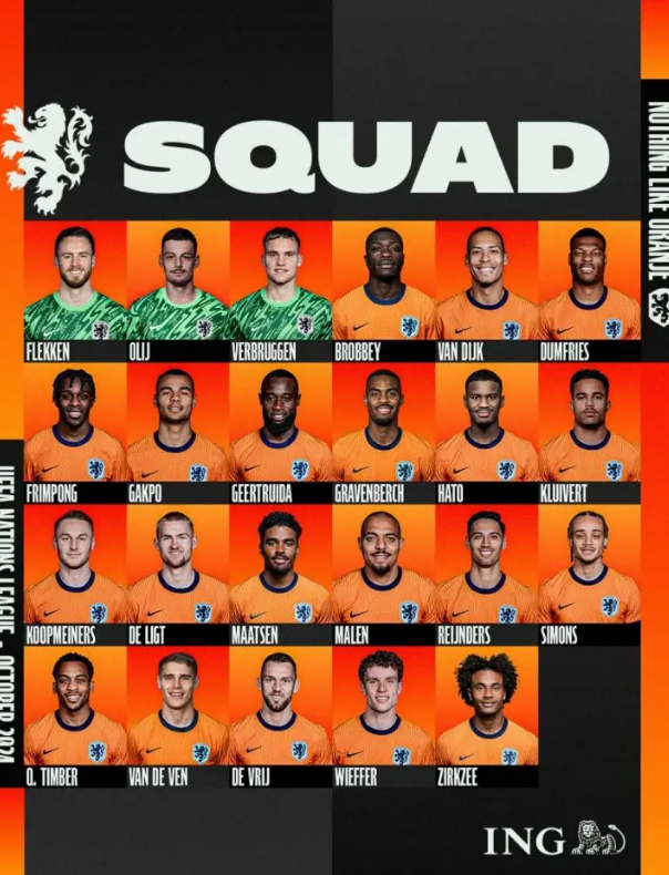相较于9月公布的初选名单,布莱顿后卫范海克、阿森纳后卫尤里恩-廷伯、埃因霍温中场斯豪滕、费尔曼、阿贾克斯前锋韦霍斯特落选,维拉后卫马特森、布莱顿中场韦费尔新入选名单2。荷兰队将在10月份的欧国联比赛中对阵匈牙利和德国26。