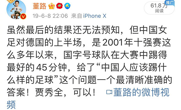 第二张截图依旧是2019年的女足世界杯,董路表示:中国女足对阵德国的上半场,是2001年的十强赛这么多年,国字号球队在大赛中踢得最好的45分钟,给了中国人应该踢什么样的足球这个问题一个最清晰准确的答案,贾秀全,可以。