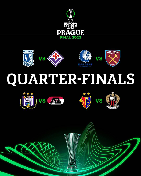 24直播网讯 北京时间3月17日晚,2022-23赛季欧会杯1/4决赛抽签结果出炉:波兹南莱赫VS佛罗伦萨、根特VS西汉姆联、安德莱赫特VS阿尔克马尔、巴塞尔VS尼斯。